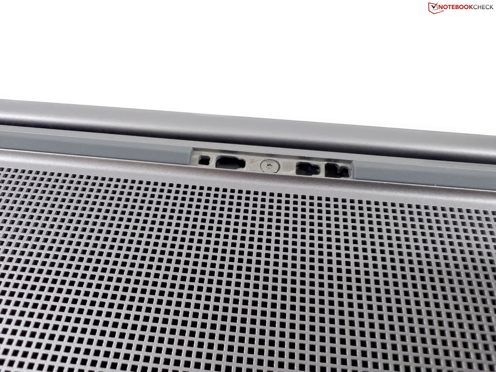 Cualitativamente, la carcasa metálica es irreprochable, ya que tanto la unidad base como la tapa de la pantalla, comparativamente fina, son extremadamente estables. Así, no pudimos percibir ningún chirrido o error de imagen. La bisagra de la pantalla también está muy bien ajustada y sólo hay un mínimo tambaleo al cambiar el ángulo de apertura, que llega a un máximo de unos 150 grados.