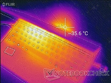Las temperaturas de la superficie son notablemente más cálidas en la mitad izquierda del teclado que en la derecha, ya que el procesador se encuentra directamente debajo de ella. La diferencia de temperatura puede ser de hasta 15 C entre las dos mitades del teclado cuando se ejecutan cargas muy altas durante períodos prolongados. Por suerte, las teclas nunca están tan calientes como para resultar incómodas.