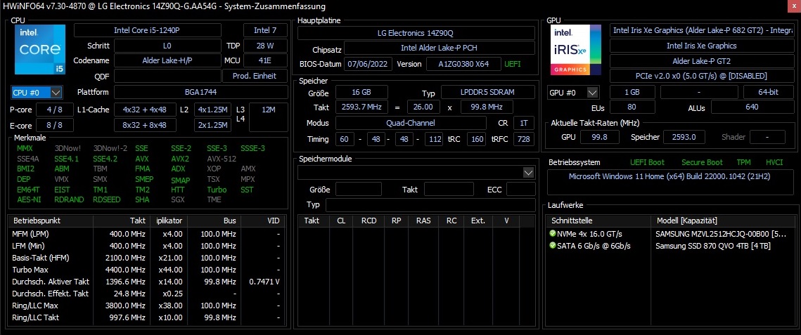 El año pasado el modelo 2021 basado en el Core i7-1165G7 recibió una excelente puntuación del 88 % en nuestro análisis. Ahora, LG ha lanzado su prometedor sucesor. Las principales diferencias y mejoras son un display mate, que sigue usando la relación de aspecto 16:10 y una resolución de 1920 x 1200 pixels (aún sólo 60 Hz). Al menos sobre el papel, la actualización de la CPU también parece enorme. En lugar de un chip Intel Tiger Lake de cuatro núcleos, el modelo 2022 utiliza el Intel Alder Lake de 12 núcleos Core i5-1240P. El resto de especificaciones del Gram 14Z90Q son menos interesantes. 16 GB de RAM y un SSD NVMe de 512 GB son igualmente estándar en el punto de precio de 1000 dólares (el dispositivo comienza desde unos 1080 dólares). Finalmente, Windows 11 Home es el sistema operativo elegido.