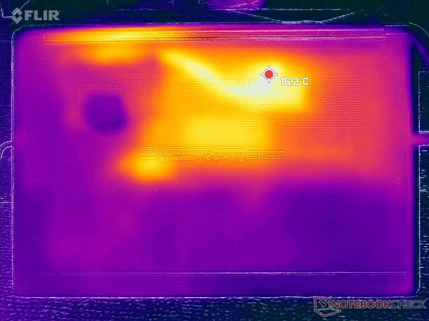 Los puntos calientes de temperatura de la superficie pueden llegar a ser mucho más cálidos en la cubierta inferior que en la cubierta del teclado, hasta en 9 C, como muestran los mapas de temperatura que aparecen a continuación. No obstante, la temperatura media es notablemente más fría que la que registramos en el lG Gram SuperSlim 2023.