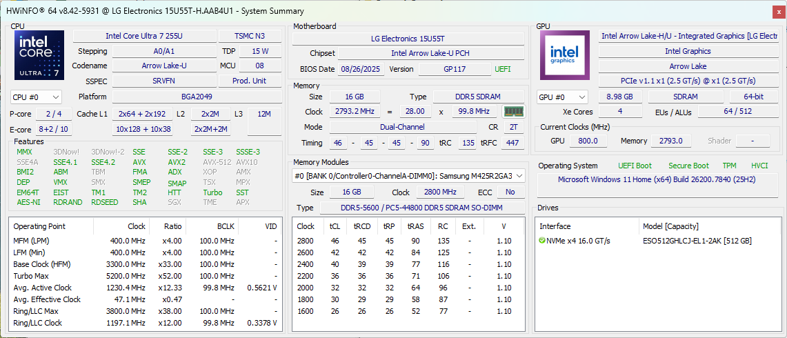 | LG Gram 15U55T Intel Core Ultra 7 255U ⎘ Intel Graphics 4-Core iGPU (Meteor / Arrow Lake) ⎘ 16 GB Memoría | Amazon: Precio de catálogo: 800 USD | 1.6 kg | 19.3 mm | 15.60" 1920x1080 141 PPI IPS | |