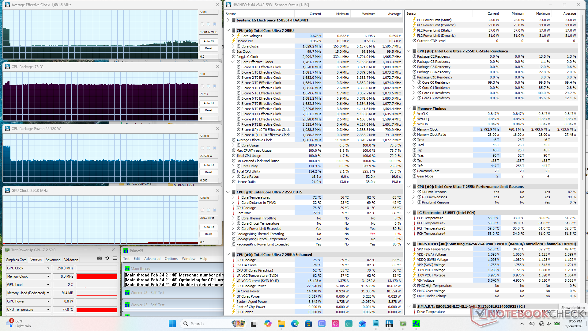 La CPU aumentaría a 3,4 GHz y 42 W al iniciar el estrés Prime95 antes de alcanzar los 82 C sólo unos instantes después. Luego se estabilizaría en 1,6 GHz, 76 C y 23 W a partir de entonces, como se muestra en las capturas de pantalla a continuación para significar la mala sostenibilidad de Turbo Boost.
