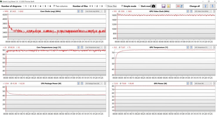 Durante nuestro test de estrés encontramos que tanto la CPU (42 W) como la GPU dedicada (80 W) fueron consistentes durante largos periodos de tiempo, y el rendimiento no se vio afectado en absoluto inmediatamente después del test de estrés.