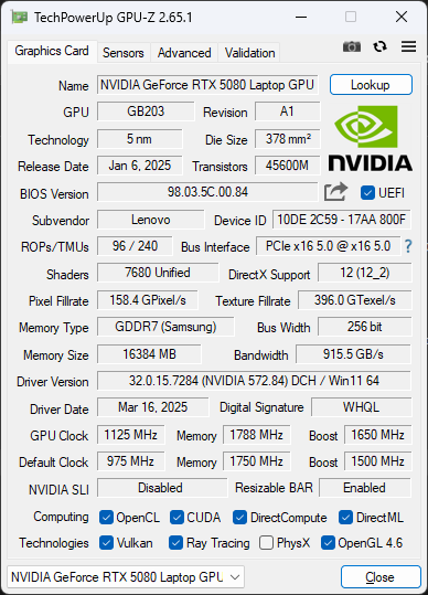 | Lenovo Legion Pro 7i 16 Gen 10 Ultra 9 275HX, GeForce RTX 5080 Laptop, SK Hynix HFS001TEJ9X115N, OLED, 2560x1600, 16" | Lenovo Legion 9 16IRX9, RTX 4090 i9-14900HX, GeForce RTX 4090 Laptop GPU, Micron 3400 2TB MTFDKBA2T0TFH, MiniLED, 3200x2000, 16" | Asus ROG Zephyrus G16 GU605CX Ultra 9 285H, GeForce RTX 5090 Laptop, Western Digital PC SN5000S SDEPNSJ-2T00-1006, OLED, 2560x1600, 16" | Razer Blade 16 2025 RTX 5090 Ryzen AI 9 HX 370, GeForce RTX 5090 Laptop, SSSTC CA6-8D2048, OLED, 2560x1600, 16" | MSI Vector 16 HX A14V i9-14900HX, GeForce RTX 4080 Laptop GPU, WD PC SN560 SDDPNQE-1T00, IPS, 2560x1600, 16" | Alienware x16 R2 P120F Ultra 9 185H, GeForce RTX 4080 Laptop GPU, WDC PC SN810 1TB, IPS, 2560x1600, 16" | |