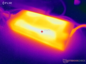 Las temperaturas superficiales no son tan cálidas como en el Blade 16 debido a las rejillas de ventilación más grandes y al diseño trasero extendido del Lenovo. Los puntos calientes en el centro del teclado pueden alcanzar hasta 40 C mientras que las teclas WASD, las teclas de flecha y los reposamanos permanecen más fríos para un juego más cómodo.