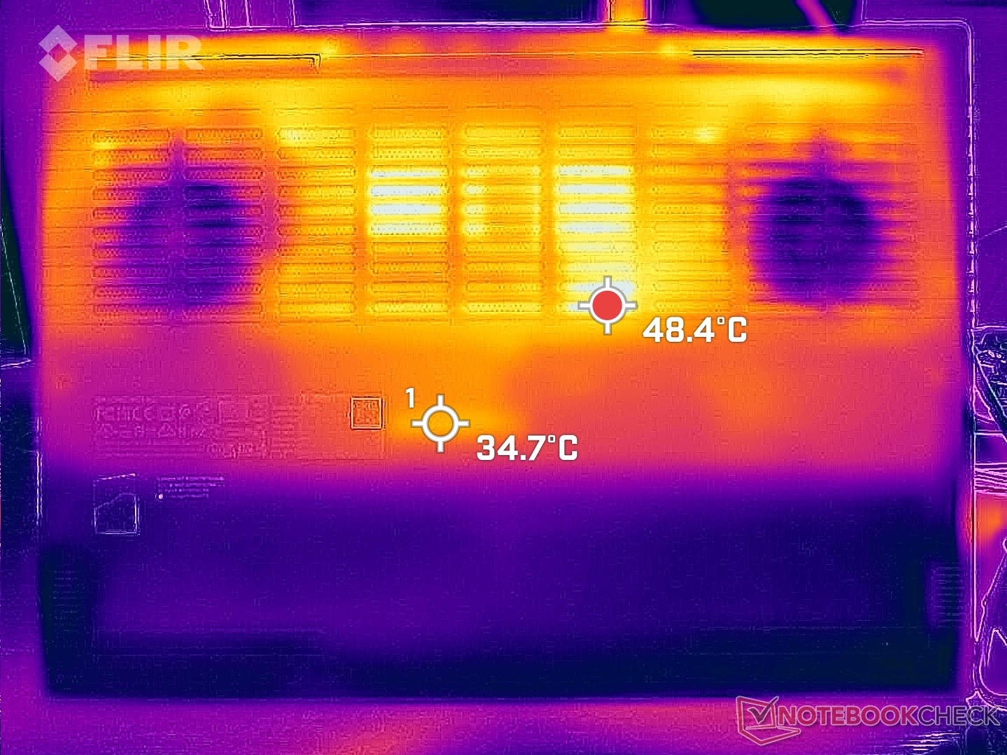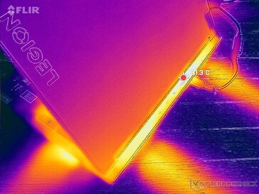 Las temperaturas de la superficie son inferiores a las que registramos en el Legion Pro 5 y en algunos competidores como elDell G16 7620. Los puntos calientes al ejecutar cargas exigentes en nuestra unidad alcanzaban hasta 42 C en los lados superior e inferior, respectivamente, en comparación con los 54 C de cada uno de los sistemas Legion Pro 5 y Dell antes mencionados. Las temperaturas superficiales son de las más frescas que hemos visto en un portátil de juego delgado y esto puede atribuirse a las temperaturas relativamente frescas del núcleo al jugar, como se demuestra en nuestra sección de prueba de estrés a continuación.