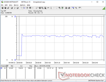 Podemos medir un consumo máximo de 207 W con el adaptador de CA de 230 W y tamaño medio (~16.8 x 8.6 x 2.5 cm) cuando CPU y GPU están al 100% de uso. El consumo disminuye con el tiempo antes de estabilizarse en torno a los 180 W.