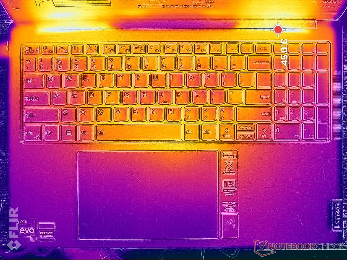Las temperaturas superficiales son más cálidas cerca de las regiones centrales, donde los puntos calientes pueden alcanzar más de 38 C y 44 C en la parte superior e inferior, respectivamente. El teclado del Lenovo no está tan caliente como el delInspiron 16 Plus 7620 donde el centro puede alcanzar los 50 C bajo carga.