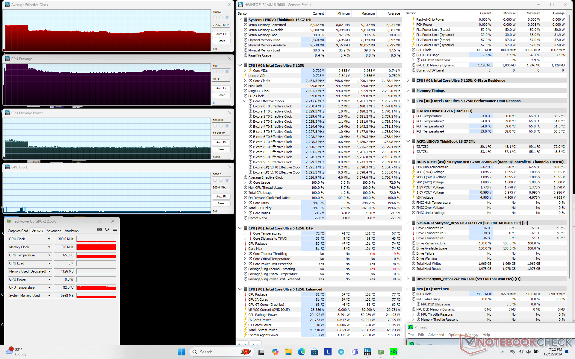 Ya hemos mencionado que la Core Ultra 5 125U no es mucho más rápida que sus rivales de la serie U. Sin embargo, el consumo de energía es generalmente menor con la CPU de Intel, por lo que sigue beneficiándose de un mayor rendimiento por vatio. Por ejemplo, ejecutar Prime95 consumiría unos 44 W de media en comparación con los 50 W del Ryzen 5-powered ThinkBook 16 G6 a pesar de que los dos modelos ofrecen niveles similares de rendimiento. El delta es ligeramente mayor a favor de Intel cuando se ejecuta FurMark para estresar sus respectivas GPU integradas.