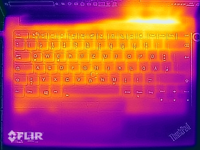 El ThinkPad E14 G3 no es incómodo de calentar, a pesar del silencioso ventilador. Podemos determinar casi 50 °C en la parte inferior durante el test de estrés y no deberías poner el dispositivo en tu regazo en este escenario, pero no hay limitaciones en situaciones cotidianas. La velocidad del ventilador es algo menor cuando juegas a juegos como Witcher 3, por lo que el chasis se calienta incluso un poco más