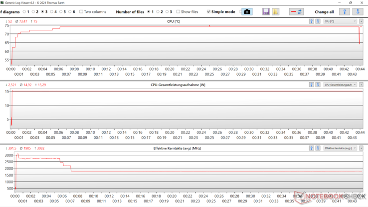Bajo carga combinada (Prime95 + FurMark), el procesador AMD consume unos 23 vatios al principio y se estabiliza rápidamente en 15 vatios. El reloj de la CPU es de 3,7 GHz durante unos segundos, baja a 2,75 GHz y se mantiene ahí durante unos 12 minutos hasta que se ralentiza sucesivamente hasta los 1,8 GHz finales. Esto es ligeramente inferior al reloj base de 2,3 GHz, pero en los escenarios cotidianos no notamos ninguna caída del reloj por debajo del reloj base, que es de 2,75 GHz permanentes bajo carga pura de la CPU. Son buenos resultados. Tras unos 82 °C iniciales, la temperatura del núcleo se estabiliza en 74 °C. La iGPU Vega funciona a 900 MHz durante 7 minutos bajo carga combinada y luego de forma estable a 550 MHz, permaneciendo muy fría a 67 °C. La iGPU por sí sola consume entre 14 y 15 vatios en la prueba de estrés.