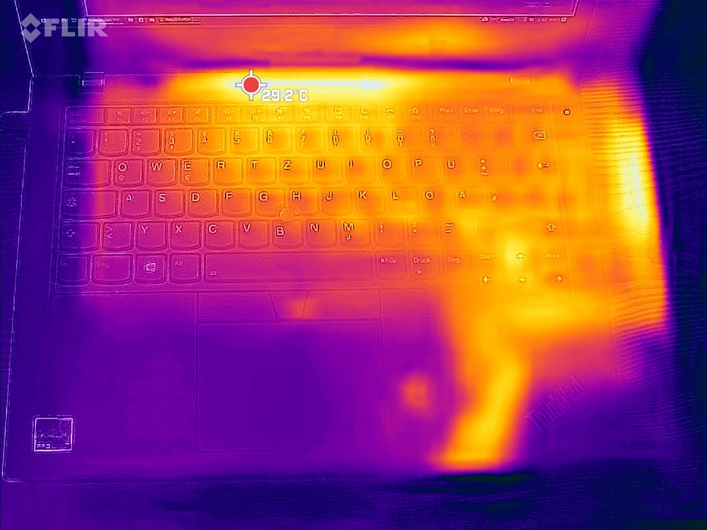 Las temperaturas en la carcasa exterior del Lenovo ThinkPad L14 Gen 2 alcanzan un máximo de 45.2 °C en el centro de la parte inferior. Esto es cálido, pero no crítico. El reposamanos siempre permanece fresco, lo que significa que no te sudan las manos cuando trabajas con el portátil Lenovo.