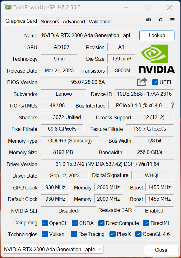 | Lenovo ThinkPad P1 G6-21FV000DGE Intel Core i9-13900H, NVIDIA RTX 2000 Ada Generation Laptop | Dell Precision 5000 5680 Intel Core i9-13900H, Nvidia RTX 5000 Ada Generation Laptop | Samsung Galaxy Book3 Ultra 16, i9-13900H RTX 4070 Intel Core i9-13900H, NVIDIA GeForce RTX 4070 Laptop GPU | HP ZBook Studio 16 G9 62U04EA Intel Core i7-12800H, NVIDIA RTX A2000 Laptop GPU | MSI CreatorPro Z16P B12UKST Intel Core i7-12700H, NVIDIA RTX A3000 Laptop GPU | Schenker VISION 16 Pro (M23) Intel Core i7-13700H, NVIDIA GeForce RTX 4070 Laptop GPU | Lenovo ThinkPad X1 Extreme G5-21DE003RGE Intel Core i7-12700H, NVIDIA GeForce RTX 3060 Laptop GPU | |