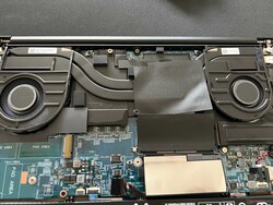 La cubierta inferior de la carcasa puede retirarse fácilmente. Nuestro dispositivo de pruebas dispone de refrigeración convencional con aletas de refrigeración, lo que permite dos ranuras para unidades SSD M.2-2280. Además, hay dos ranuras SODIMM para módulos RAM, pero el módulo WLAN no se puede intercambiar.