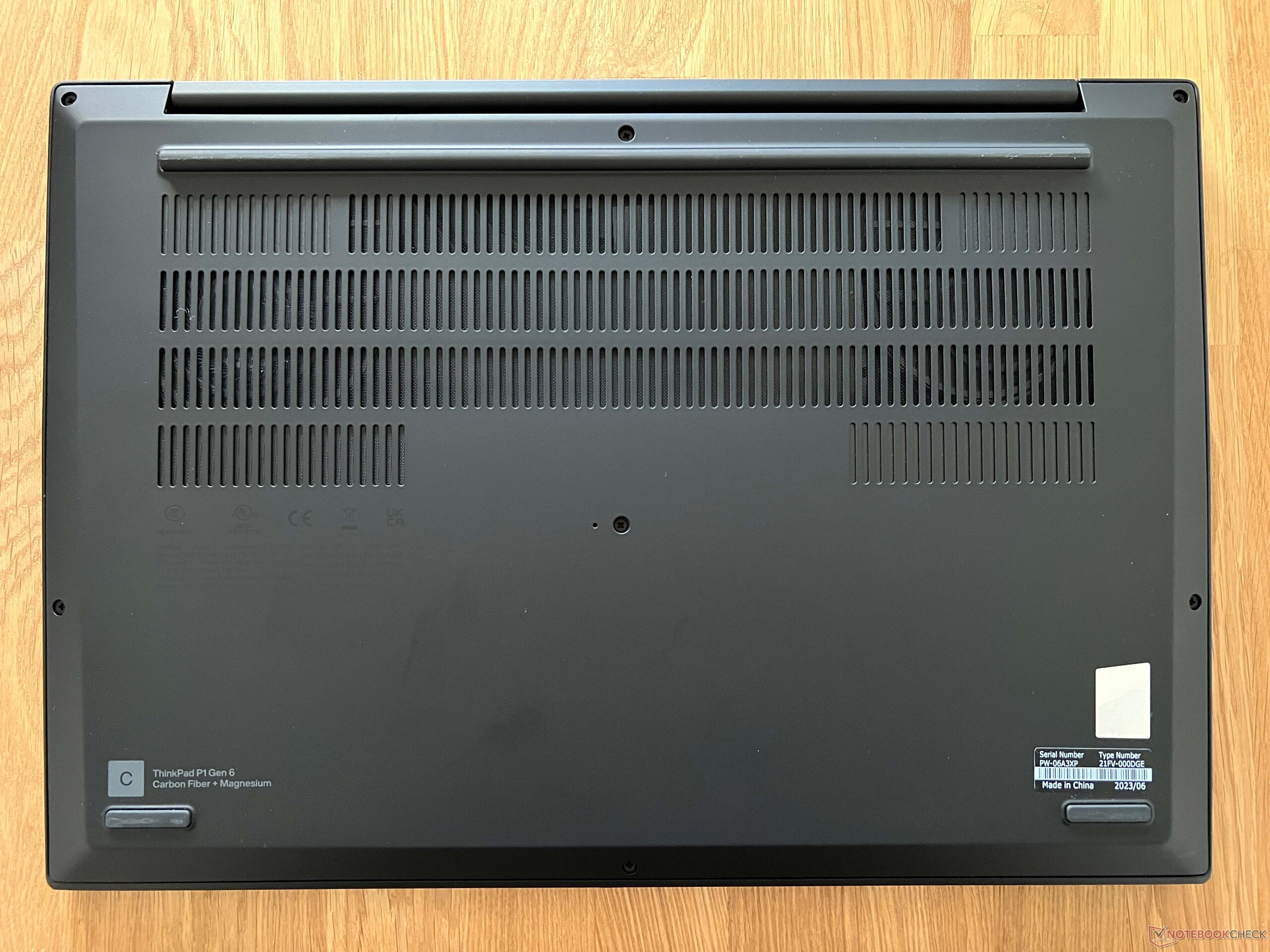 Lenovo conserva el conocido diseño para el ThinkPad P1 Gen 6, manteniendo la coherencia con sus predecesores, las generaciones G4 y G5. El diseño negro puede percibirse como simple o poco emocionante, dependiendo de las perspectivas individuales. No obstante, la identidad distintiva del ThinkPad sigue siendo inconfundible. Los modelos con pantalla OLED siguen mostrando una tapa de pantalla con un patrón de fibra de carbono, aunque se trata de un diseño impreso en lugar de fibra de carbono real. En general, el diseño mantiene un aspecto contemporáneo, pero las superficies lisas son susceptibles de acumular suciedad y grasa con el tiempo, lo que requiere una limpieza regular.