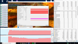 En la prueba de esfuerzo con Prime95 y FurMark, la T580 muestra un comportamiento similar al del bucle de pruebas Cinebench. El T580 comienza la prueba a 3,7 GHz. Después de 28 segundos, el límite del TDP se activa y la frecuencia del reloj baja a 3 GHz. Después de 2 minutos, la T580 alcanza el límite de temperatura de 80 °C (176 °F) y la velocidad del reloj desciende aún más hasta 2,3 a 2,4 GHz. En una prueba de referencia posterior, la frecuencia de la CPU baja aún más hasta 1,8 a 1,9 GHz, donde se estabiliza. Las temperaturas centrales se sitúan en torno a los 72 °C (161,6 °F). La GPU también se desacelera debido al sobrecalentamiento: después de 20 minutos, el reloj central de la GPU se hunde hasta los 900 MHz. Después de eso, la velocidad del reloj de la GPU se estabiliza.