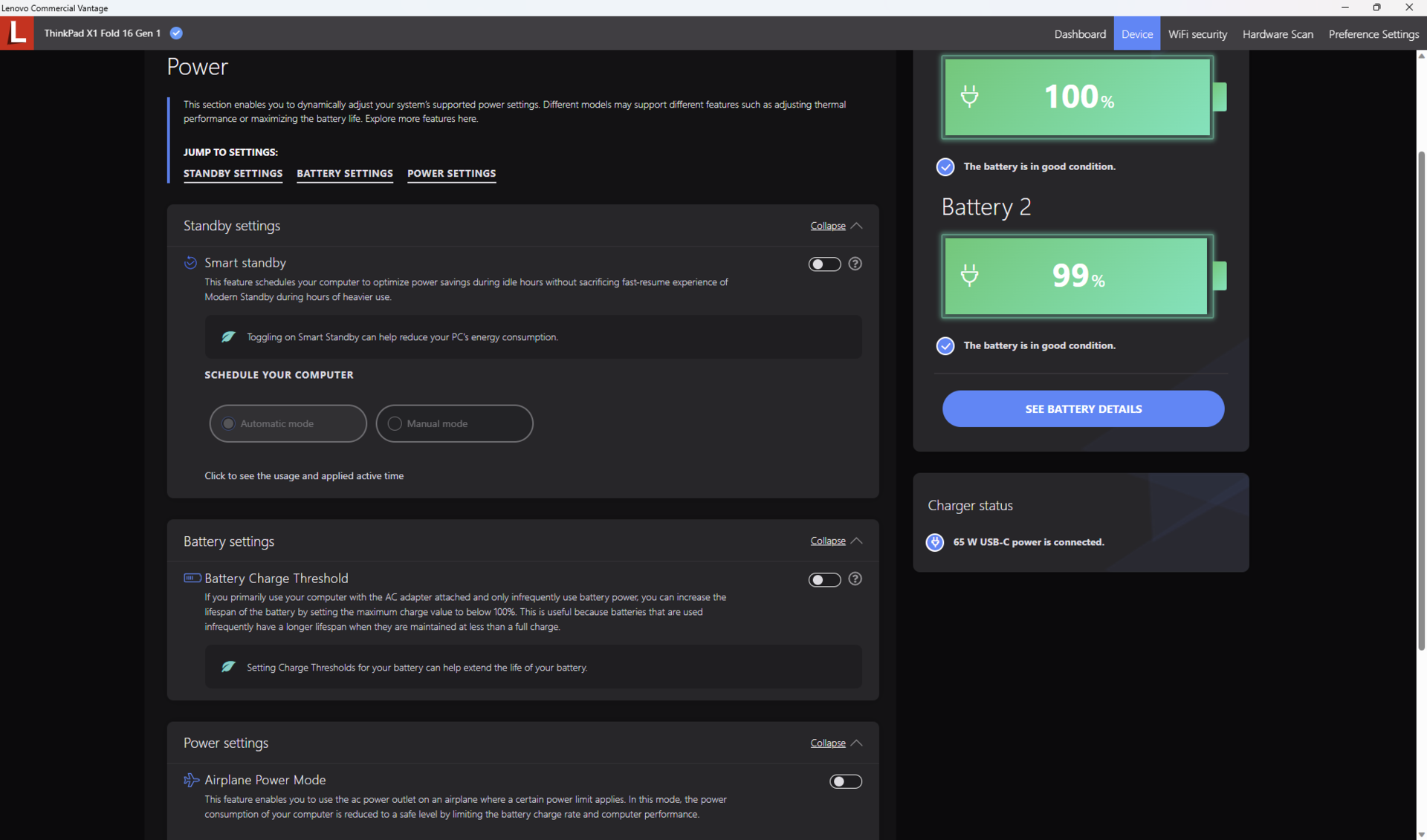 En general, el consumo de energía está en línea con el de los portátiles tradicionales. Aunque el diseño sin ventilador ahorra energía, la gran y exigente pantalla táctil OLED anula el ahorro potencial. Por ejemplo, en ralentí en una pantalla blanca brillante (como una página web o una página de Word) en el brillo máximo consumiría 22 W en el ThinkPad X1 Fold en comparación con sólo 11 W o 10 W en el Microsoft Surface Pro 9 basado en IPS o el HP Elite Dragonfly Folio.