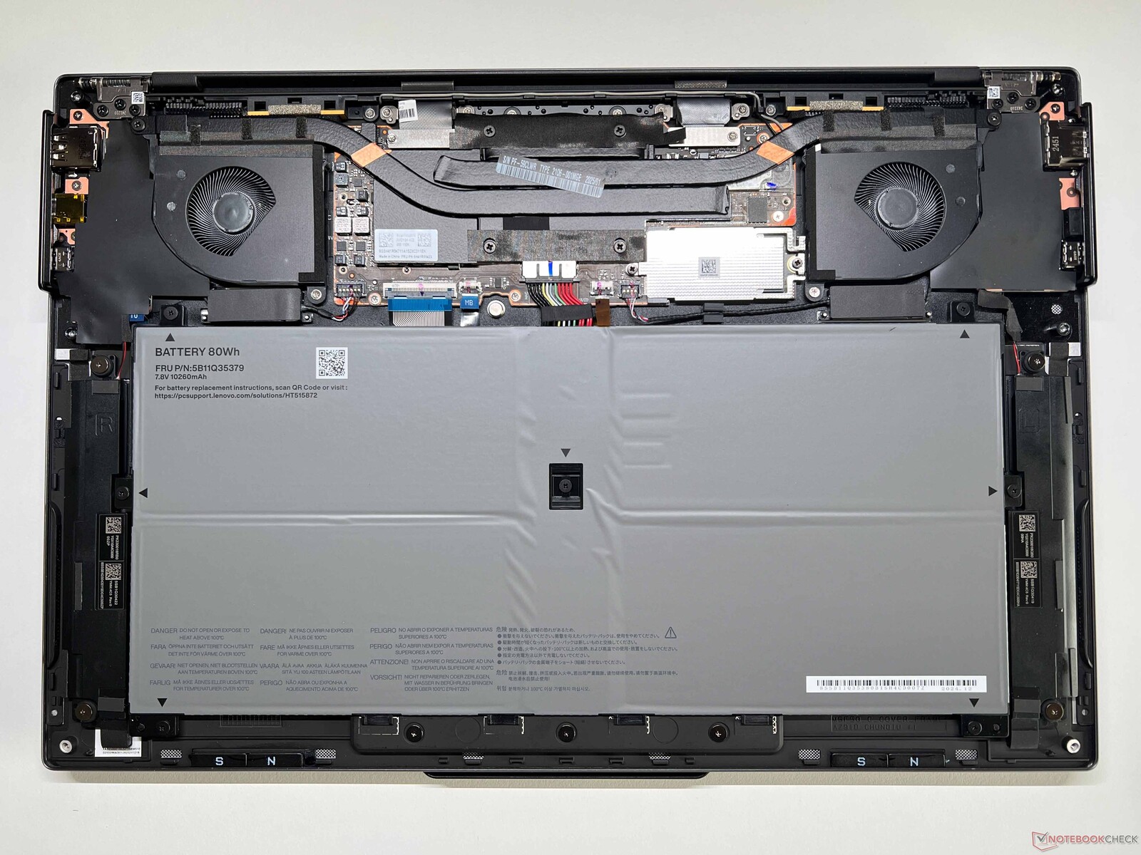 Lenovo proporciona un manual de mantenimiento de hardware para el ThinkPad X9 y la cubierta inferior está asegurada por tornillos Philips normales (atención: sólo afloje los tornillos, no los retire con fuerza). La gran batería de 80 Wh domina la distribución interna y todos los componentes principales se encuentran en la sección superior, donde el chasis es más grueso. Tanto la SSD M.2-2242 como la batería pueden sustituirse en caso necesario, pero todos los demás componentes están a bordo.