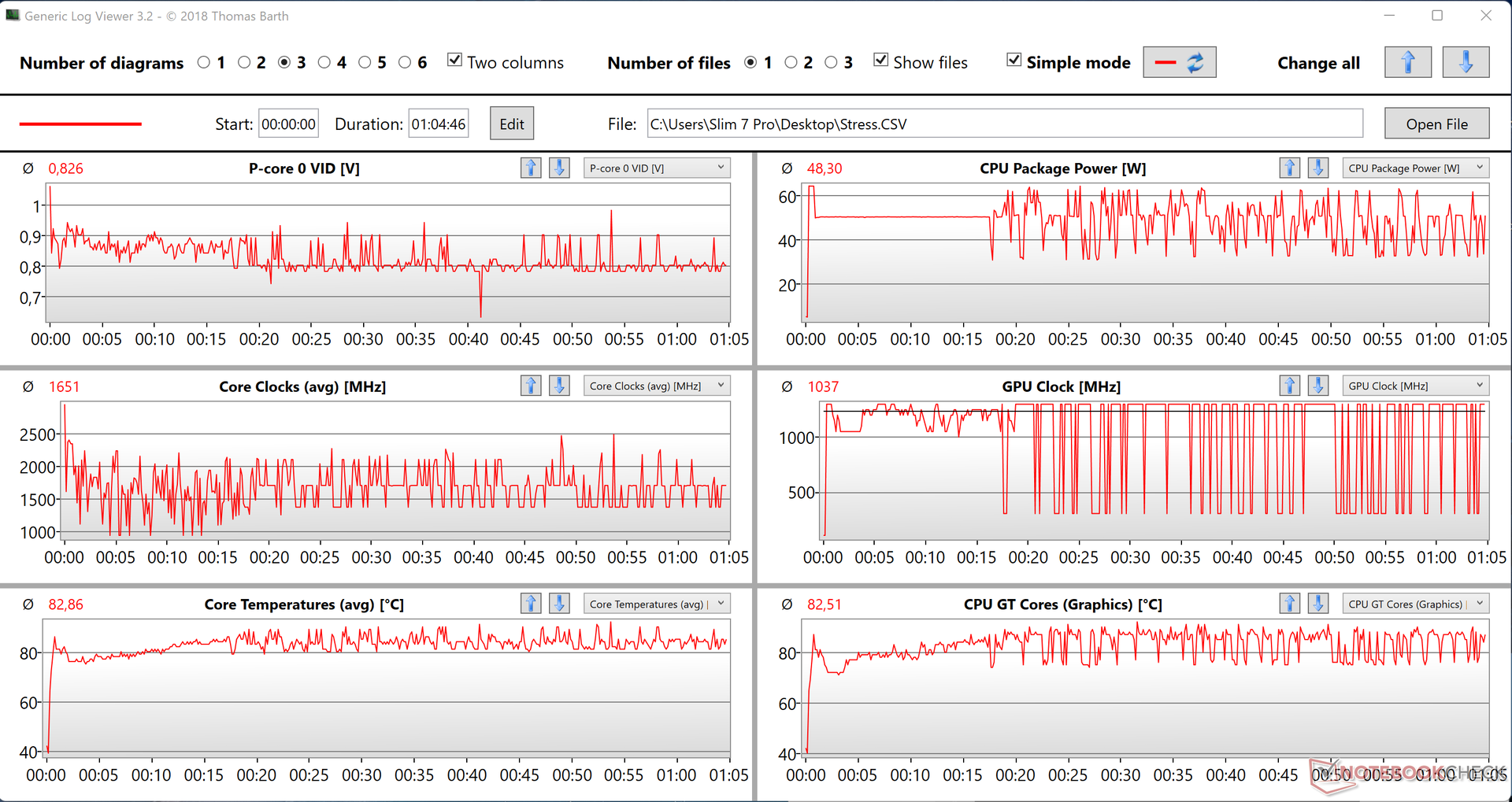 En nuestro test de estrés estandarizado con utilización total de CPU/GPU, la velocidad media de la CPU se estabiliza en 1.650 MHz y a una potencia de paquete de algo menos de 50 vatios, pero fluctúa mucho a una temperatura media de algo menos de 83 °C tras un breve pico inicial. La GPU funciona a una media de poco más de 1.000 MHz a 82 °C, pero también cae en picado repetidamente en términos de velocidad de trabajo.