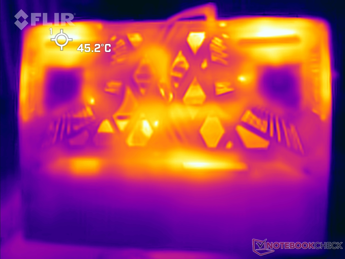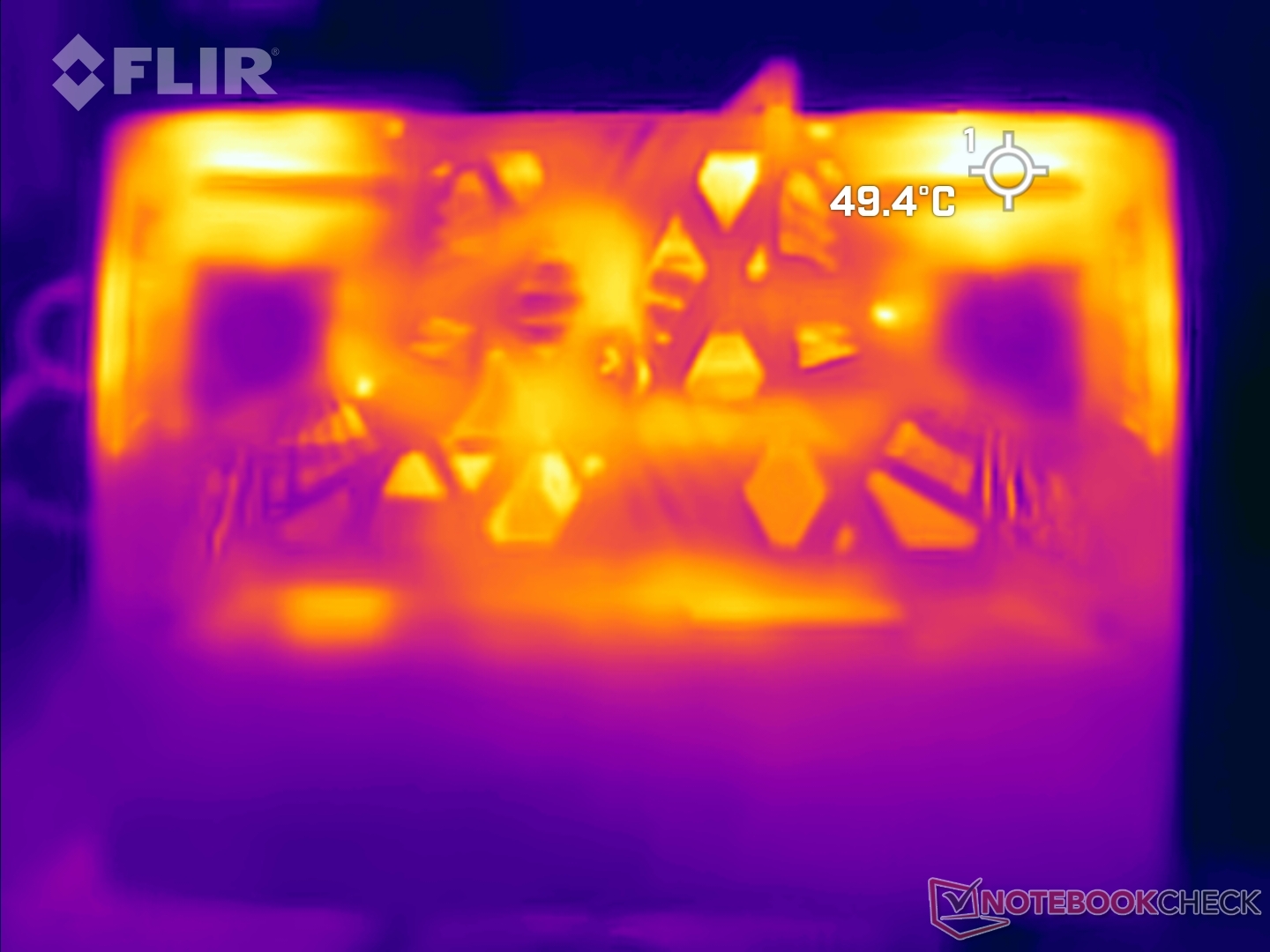 Las temperaturas de la superficie pueden alcanzar hasta 45 °C en la parte superior y casi 49 °C en la inferior bajo carga en el modo de rendimiento extremo.