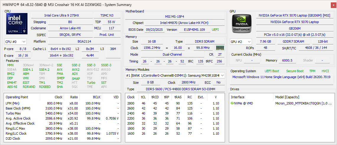 Nuestra unidad Crosshair 16 HX AI cuenta con el Core Ultra 9 275HX y una GPU RTX 5070 de 115 W para portátiles junto con 16 GB de memoria DDR5-5600, una SSD NVMe de 1 TB y una pantalla QHD+ de 240 Hz de nivel IPS en un familiar Crosshair 16 HX D14 chasis.