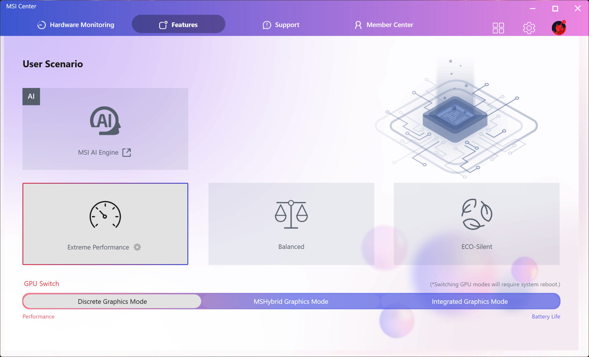 El modo de rendimiento extremo libera todo el potencial de la IA Crosshair 16 HX, pero esto viene con la perdición de un aumento de las emisiones de calor y ruido junto con un mayor consumo de energía.