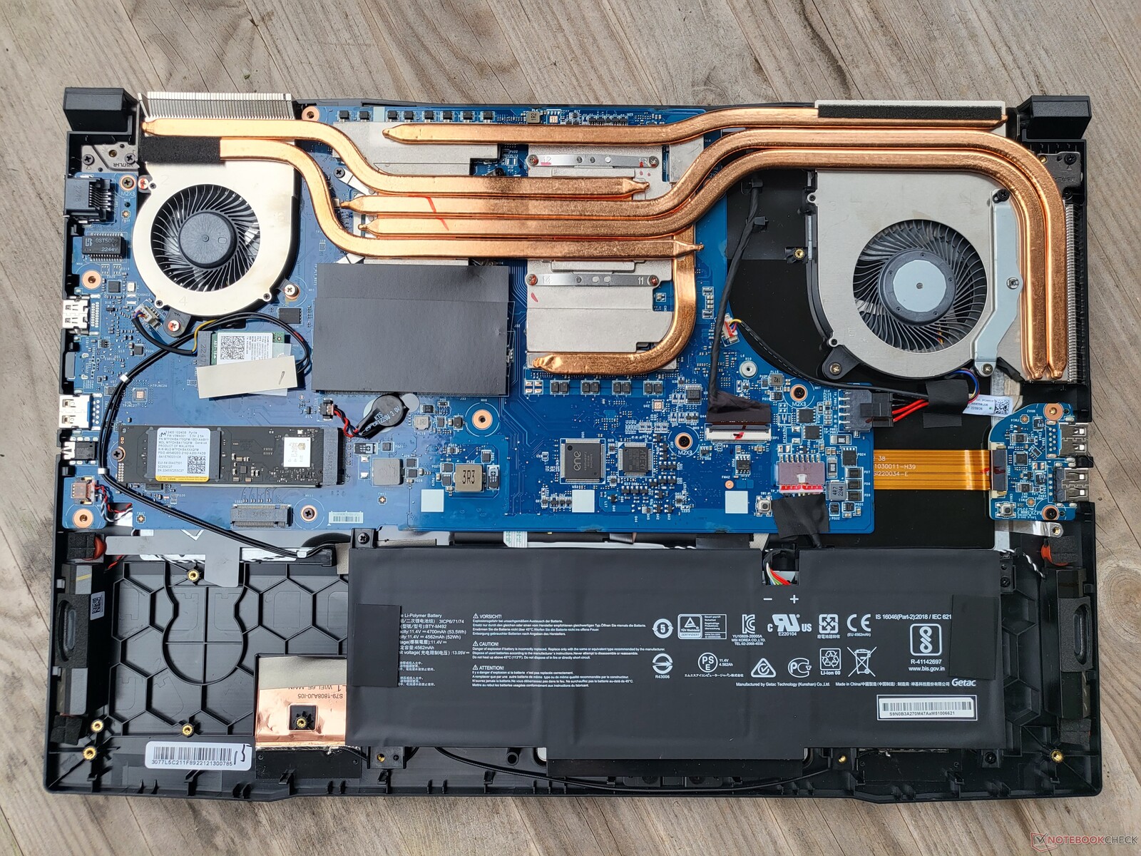 Trece tornillos y algunos clips impiden acceder a los componentes internos del Katana. El módulo WiFi, el SSD M.2 2280 y ambos módulos de RAM se pueden actualizar. Además, puedes acceder al gran sistema de refrigeración de dos ventiladores y también a la batería, que es bastante pequeña para un dispositivo de este tamaño. Hay mucho espacio libre junto a la batería, lo que demuestra que habría sido posible una batería más grande. Curiosamente, hay un peso en la placa base que hace que el portátil MSI parezca más pesado - posiblemente debido al gran espacio libre.