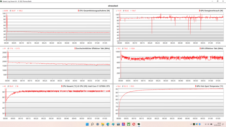 En un periodo de tiempo más largo, el consumo de la CPU durante la prueba de estrés es de 33 vatios, mientras que en los primeros 10 minutos de la prueba de estrés, aún es capaz de utilizar 45 vatios. Sin embargo, la CPU y la GPU simplemente cambian un poco el consumo común compartido, que se sitúa en torno a los 120 vatios. No notamos ningún problema significativo en las temperaturas de ambos chips. A 90 y 95 °C respectivamente (194 y 203 °F), ambos caen en un rango alto pero aún no crítico y pueden mantenerse de forma estable.
