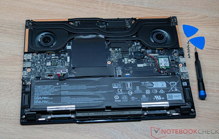 Es posible realizar tareas de mantenimiento en el MSI Stealth 16 Studio A13VG. Sin embargo, para ello es necesario desmontar la placa base, que está sujeta por una serie de tornillos. Después de quitar los tornillos, la placa base permanece firmemente unida a la base. Sin embargo, con las herramientas adecuadas, pudimos retirar la placa base. No obstante, se recomienda precaución para evitar daños. En principio, se pueden intercambiar o ampliar componentes como la RAM o el dispositivo de almacenamiento masivo, ya que hay disponible una ranura M.2 2280 adicional. Del mismo modo, el Wi-Fi no es fijo y también se puede cambiar o sustituir.