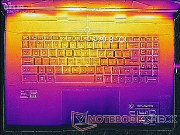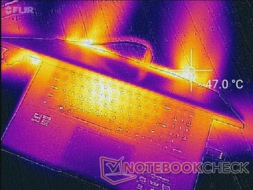 Los puntos calientes de la superficie cuando se juega son más o menos los mismos que registramos en el GS76, alrededor de 49 C cerca del centro del teclado y 61 C en la parte inferior. Sin embargo, la distribución de la temperatura es mejor en el nuevo modelo, ya que los reposamanos están ahora mucho más fríos, por debajo de los 30 C en comparación con los 35 C o más del GS76