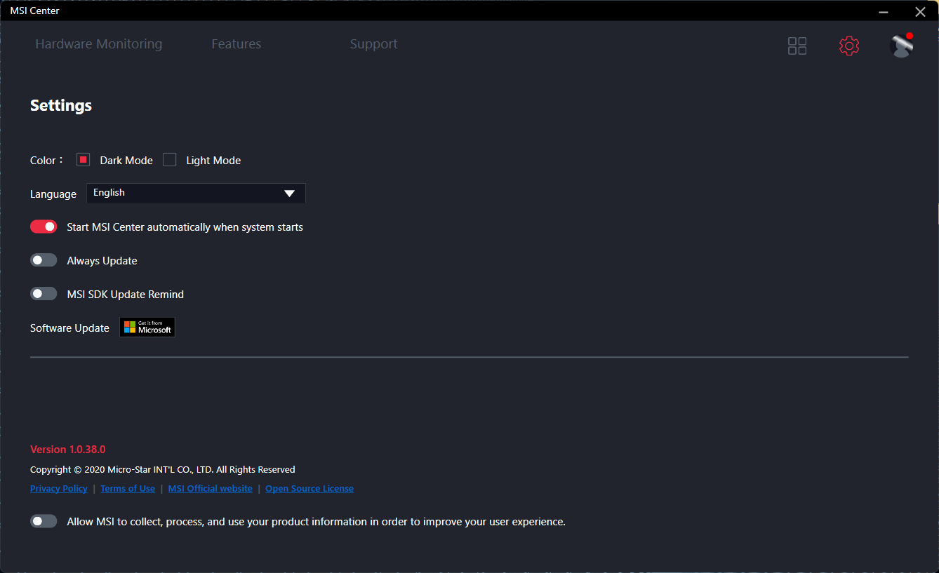 Las temperaturas de la superficie dependen en gran medida de la configuración del perfil de potencia del MSI Center. Cuando está en modo equilibrado, los puntos calientes pueden alcanzar los 49 C comparado con sólo 42 C si está en la configuración de Rendimiento Extremo ya que un techo de RPM del ventilador más alto está ligado al modo de Rendimiento Extremo