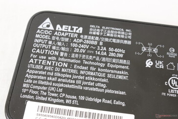 Registramos un consumo máximo temporal de 278 W desde el gran adaptador de CA de 280 W (~18 x 8,5 x 3,5 cm) cuando ejecutamos Prime95 y FurMark simultáneamente. La batería sigue recargándose a un ritmo decente cuando se juega.