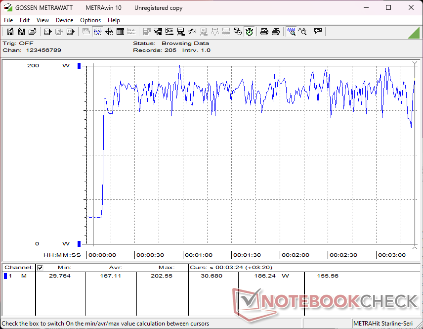 Los juegos demandan unos 179 W de media del adaptador de CA de tamaño medio (~14,4 x 7,5 x 2,3 cm) y 180 W. Esto significa que la velocidad de carga se ralentizará si se ejecutan juegos simultáneamente y también sugiere que el rendimiento podría haber sido más rápido si el modelo se hubiera enviado con un adaptador de CA más grande de 230 W. De hecho, somos capaces de registrar un consumo máximo de 203 W cuando la CPU y la GPU están a pleno rendimiento para demostrar que el sistema puede demandar más de lo que el adaptador de CA puede proporcionar con seguridad. Esto es similar a lo que observamos en el Lenovo Yoga Pro 9i 16 G9 donde encontramos que su adaptador de CA de 170 W era demasiado pequeño para la CPU Core Ultra H y la GPU RTX 4070.