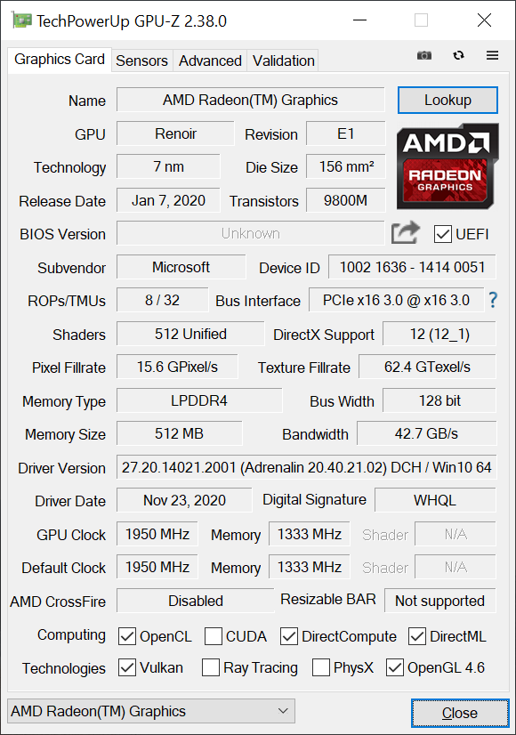 | CPU | AMD Ryzen 7 4980U | AMD Ryzen 7 4980U | AMD Ryzen 7 4980U | Intel Tiger Lake Core i7-1185G7 | Intel Tiger Lake Core i7-1185G7 |