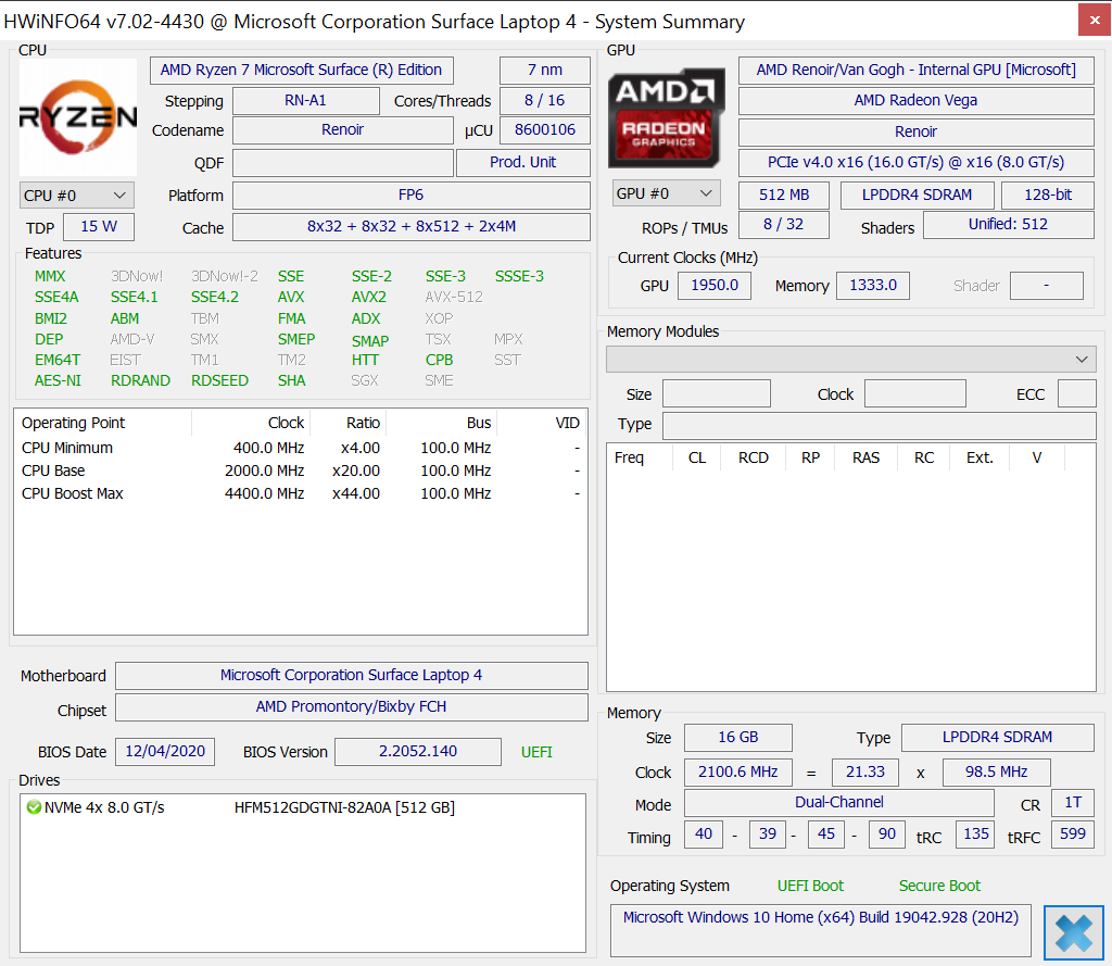 | Microsoft Surface Laptop 4 15 AMD TFF_00028 Vega 8, R7 4980U, SK Hynix BC511 HFM512GDJTNI | Schenker Vision 15 Iris Xe G7 96EUs, i7-1165G7, Samsung SSD 980 Pro 1TB MZ-V8P1T0BW | Dell XPS 15 9500 Core i5 UHD Graphics 630, i5-10300H, Toshiba KBG40ZNS256G NVMe | Tuxedo Pulse 15 Vega 6, R5 4600H, Samsung SSD 970 EVO Plus 1TB | Lenovo ThinkPad X1 Extreme Gen3-20TLS0UV00 GeForce GTX 1650 Ti Max-Q, i7-10750H, Toshiba XG6 KXG6AZNV1T02 | Microsoft Surface Laptop 3 15 Ryzen 5 3580U Vega 9, R5 3580U, SK hynix BC501 HFM256GDGTNG | |