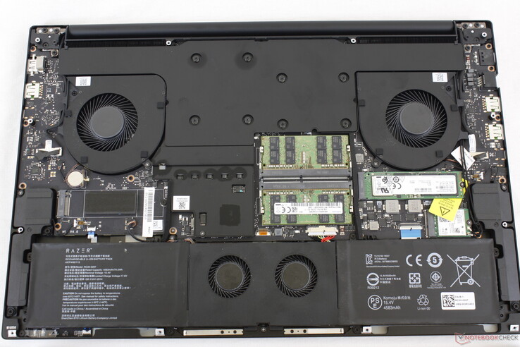 El panel inferior se fija con diez tornillos Torx T5 para facilitar el mantenimiento. Los usuarios tienen acceso directo a dos ranuras M.2 2280 SSD, dos ranuras SODIMM para hasta 32 GB DDR5-5600 o 64 GB DDR5-5200, y el módulo WLAN extraíble. Lo más destacable es que el actual diseño Blade 18 incorpora un ventilador adicional directamente debajo del clickpad, similar a los antiguos diseños Blade 17.