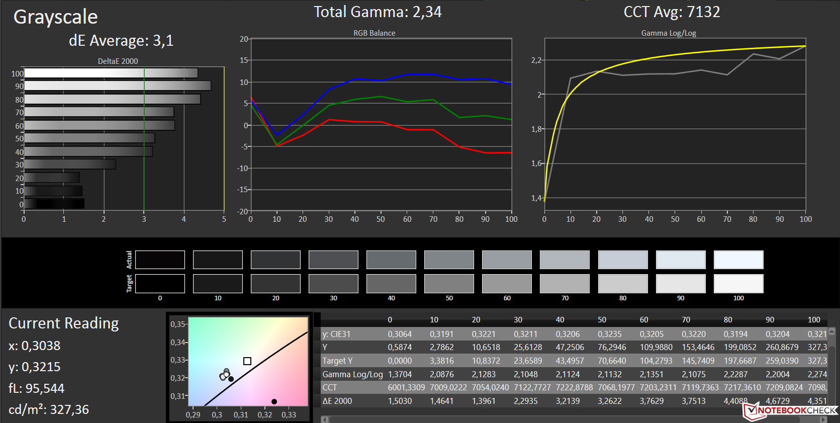 Todos los demás tests terminan bastante satisfactoriamente. Los negros son de verdad negro, con niveles de 0.2 cd/m², logrando un gran ratio de contraste en combinación con los niveles máximos de brillo del 770Z5E. Esto realmente vence al MacBook Pro 15 con Retina Display, aunque este último lleve una tecnología de display superior. Es también mucho mejor que el 700Z5C, que tenía un nivel de negro de 1.81 cd/m².