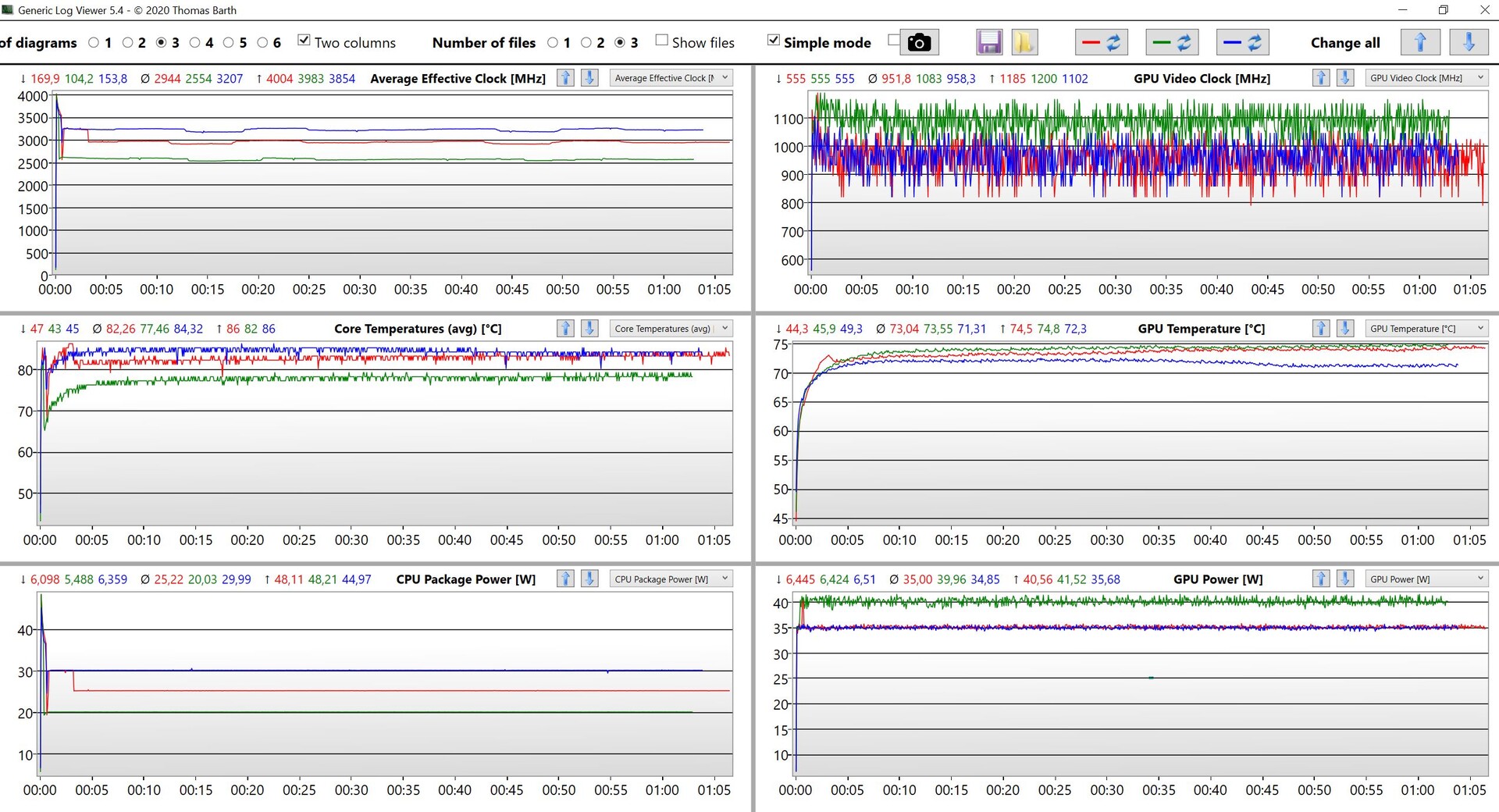 Realizamos el test de estrés usando los tres perfiles de rendimiento, y los resultados son claramente visibles en la siguiente captura de pantalla. Después de que los valores se han nivelado tras unos minutos, permanecen completamente estables.