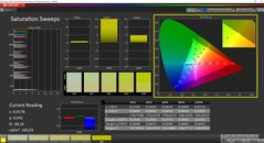 Las comprobaciones de color con CalMan muestran que el verde y el rojo están ligeramente desplazados. Esto muestra que la pantalla no alcanza del todo la cobertura sRGB, y mantiene una desviación de color máxima relativamente alta incluso después de la calibración. Sin embargo, la desviación de color media con un ΔΕ 2,5 sigue estando por debajo de la marca objetivo de 3