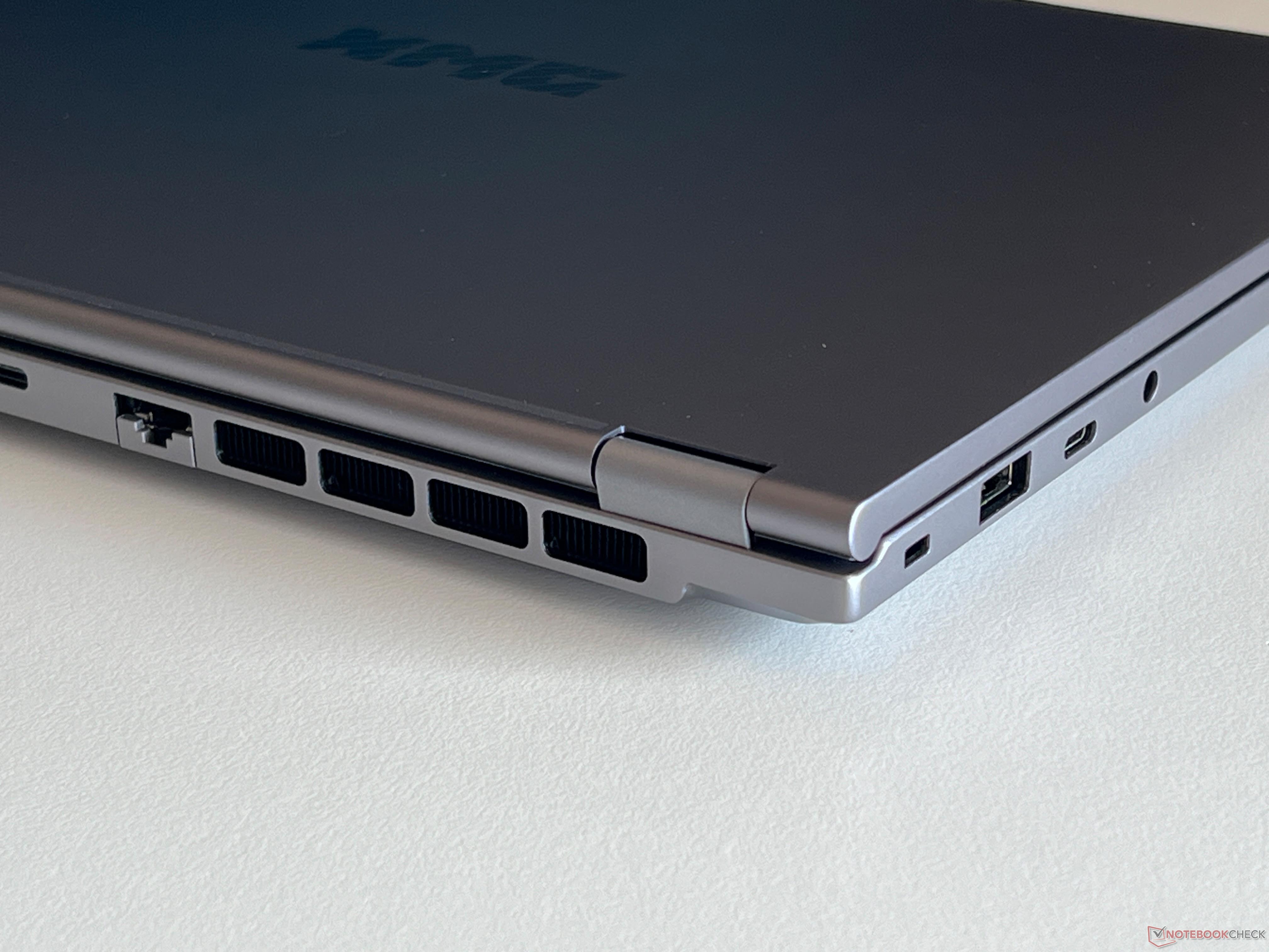 Al igual que con el XMG Evo 15el fabricante ha optado por utilizar una robusta carcasa de aluminio, salvo que la Evo 14 no es negra, sino gris oscuro. Por tanto, es mucho menos sensible a la acumulación de marcas de huellas dactilares. Su estabilidad general es muy buena y las bisagras también están bien ajustadas, por lo que el balanceo al ajustar el ángulo de la tapa es mínimo. Su ángulo máximo de apertura es de casi 180 grados.