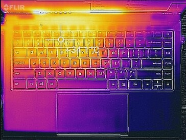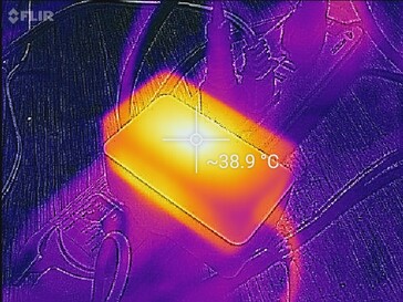A pesar de no tener ventilador, el F7 Air se mantiene relativamente fresco. Bajo carga sintética completa, la mayor parte del panel inferior se mantiene por debajo de los 40º C. Hay un punto caliente directamente sobre el SoC y el escudo térmico de cobre que alcanza los 43.8º C. Por lo demás, el calor externo no es un problema