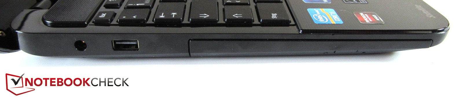 El fabricante japonés ofrece puertos estándar. El lado izquierdo ofrece un USB 2.0 (con función Sleep-and-Charge), la toma de corriente y la unidad óptica (Super Multi grabador CD/DVD). En el lado derecho, cerca del frontal, tenemos dos clavijas de audio (auriculares + micrófono), dos puertos USB 3.0, un interfaz HDMI y un puerto LAN RJ-45 Gigabit. El ventilador también está a la derecha, rodeado de una interfaz VGA y el Bloqueo Kensington. El obligatorio lector de tarjetas se sitúa al frente.