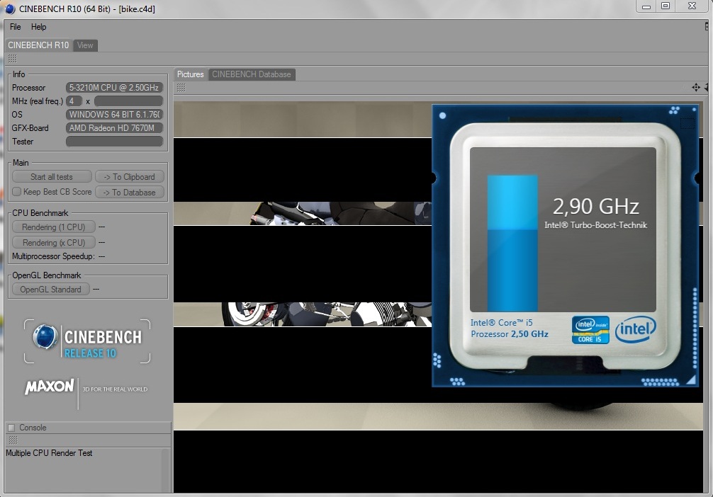 Las pruebas de CPU no guardan sorpresas desagradables. El Satellite L850 rinde tan rápido como otros modelos con un Core i5-3210M en Cinebench R10 64 bit: 5,301 y 10,921 puntos (renderizado a núcleo simple y multi-core). La i7-3610QM, mas cara, gana ligeramente en el renderizado a núcleo simple (5,640 puntos en el Samsung 550P7C-S02DE), pero el hueco en renderizado multi-core es mucho mayor (21,117 puntos en el Asus K55VM-SX064V).