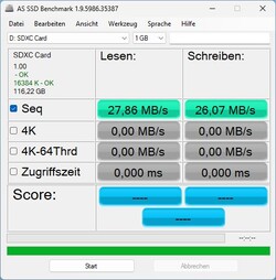 Medimos velocidades de lectura y escritura secuenciales de sólo unos 27 MB/s, lo que no está en absoluto a la altura de nuestra tarjeta de referencia AV PRO MicroSD 128 GB V60. Copiar 1 GB de material de imagen de la tarjeta al escritorio lleva la friolera de ¡48 segundos! La competencia es mucho más rápida, aunque la Legion 5 y la XMG no son decisivas.