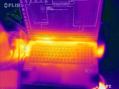 Cuando ejecutamos la misma prueba de estrés en modo equilibrado, medimos temperaturas superficiales medias de sólo 32 °C en la parte superior y 33 °C en la inferior.