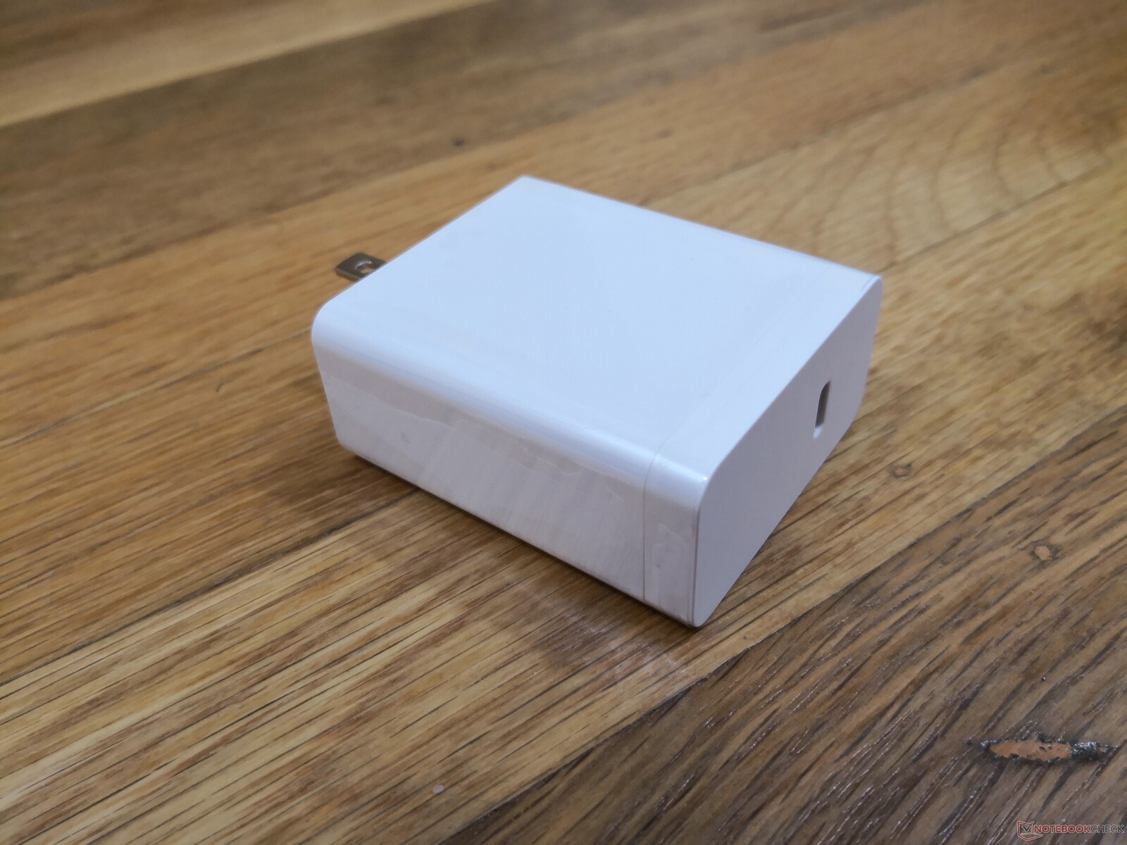 En reposo en el escritorio sin aplicaciones en marcha consume entre 5 W y 8 W según el nivel de brillo y el perfil de energía, lo que es sorprendentemente similar a muchos portátiles ULV. Los juegos consumen unos 37 W con el pequeño (~6.4 x 5.5 x 2.8 cm) adaptador USB-C de 65 W.