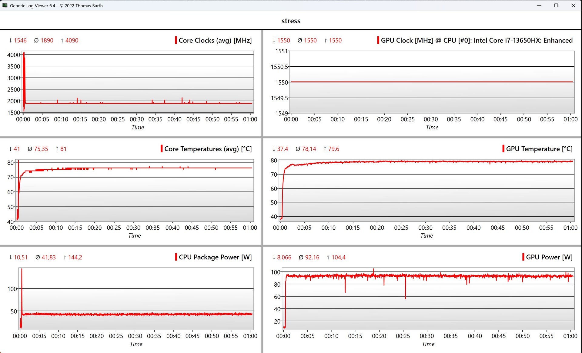 El Intel Core i7-13650HX (Raptor Lake) hace las veces de procesador, con unos límites de potencia de 140 y 95 vatios, significativamente superiores a los de la versión AMD. En general, sin embargo, el rendimiento de la CPU es sólo ligeramente mejor que el del chip Zen 4. En modo batería, el rendimiento de la CPU cae en torno a un 40%.