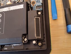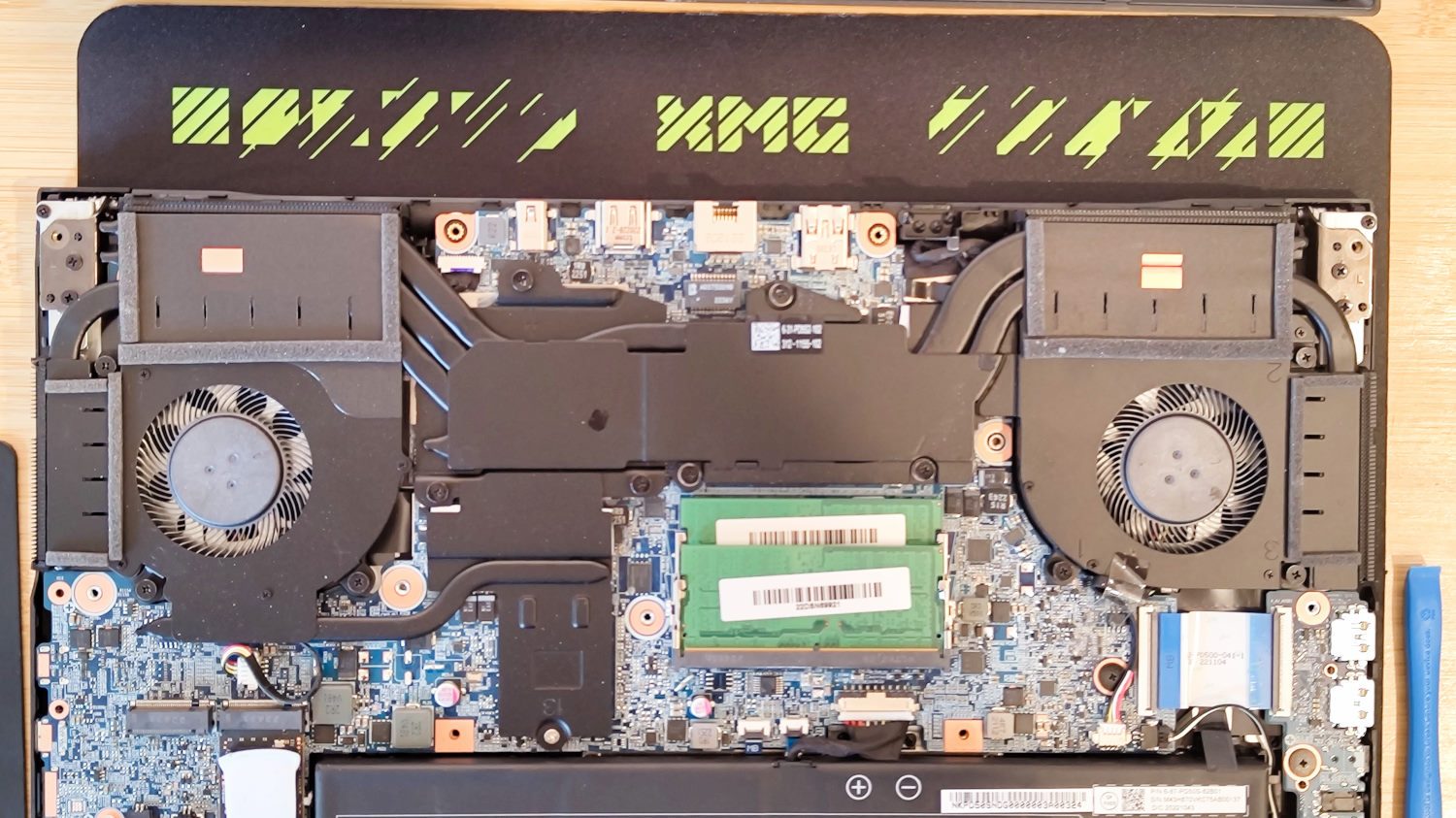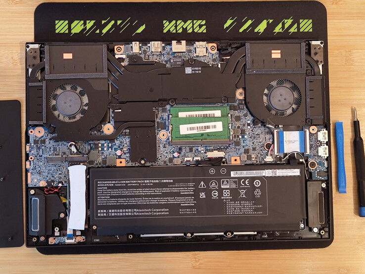 Un total de 15 tornillos fijan la tapa de la base. Al desenroscarlos, la tapa puede abrirse fácilmente desde la parte frontal con la ayuda de una herramienta de apertura de plástico. Debajo, encontrarás RAM intercambiable y una ranura M.2 libre para un SSD adicional. La almohadilla térmica adecuada se incluye con el portátil, al igual que un CD con controladores, una memoria USB con el mismo contenido, una alfombrilla de ratón grande y un abridor de botellas.