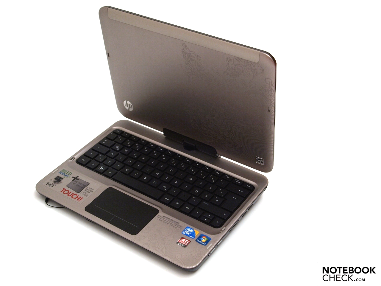 El Touchsmart tm2 llama la atención con sus superficies de aluminio con patrones combinadas con elementos de plastico negro y puntua aun más por su estabilidad y acabado en general. La escritura es sencilla gracias a su forma de cuña. Sin emargo, en modo tablet, este diseño no es tan agradable.