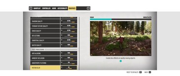 Ubisoft no sería Ubisoft si no proporcionara un punto de referencia integrado. Sin embargo, la prueba de rendimiento sólo está disponible en el juego (no funciona si se abre el menú de ajustes después del lanzamiento). La secuencia de prueba dura dos minutos y consiste en una toma panorámica de varias zonas de vegetación.